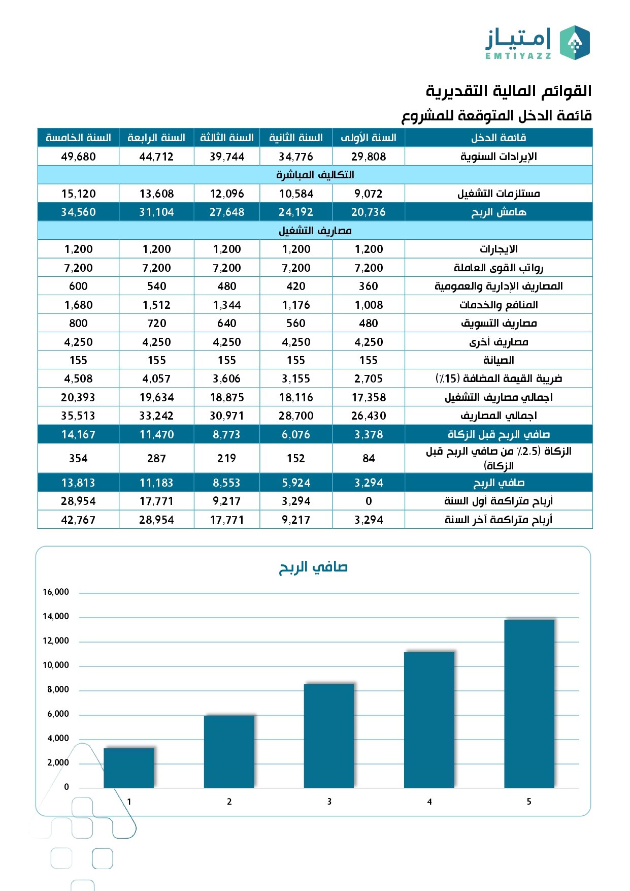 - قائمة الدخل المتوقعة للمشروع (بالإضافة لرسم بياني)